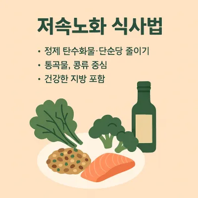 저속노화 식단은 ‘균형 잡힌 영양’, ‘혈당 안정화’, ‘항산화 성분 섭취’라는 세 가지 큰 원칙을 기반으로 합니다.
