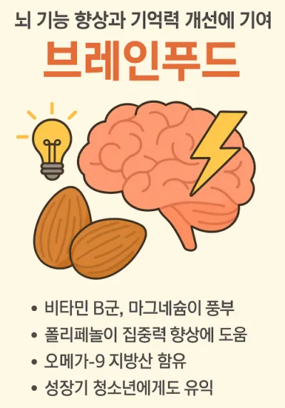 이처럼 아몬드 효능은 단순한 식품 그 이상의 가치로, 두뇌를 위한 식습관의 일부로 자리 잡을 수 있습니다.