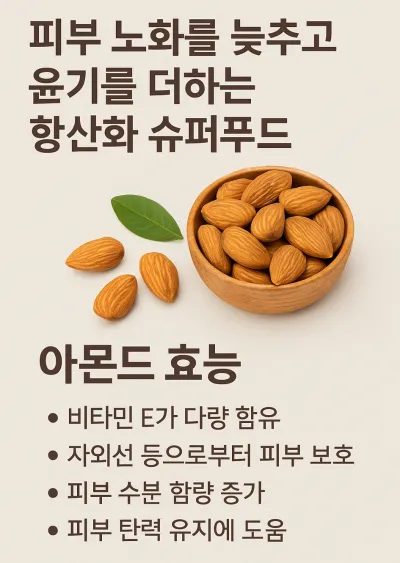 이처럼 아몬드 효능은 겉으로 보이는 피부 건강에도 매우 긍정적인 영향을 미치며, 특히 여성층 사이에서 ‘먹는 화장품’이라는 별칭으로 불리기도 합니다.