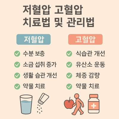 | 진단 방법 | 혈압 측정, 기립성 혈압 검사 | 가정 혈압계 활용, 병원 정기검진 |