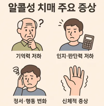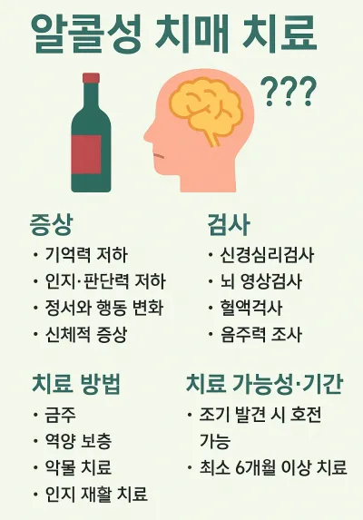- 특징: 일반 치매와 달리 발병 연령이 낮을 수 있고, 금주를 통해 호전 가능성이 존재합니다.
