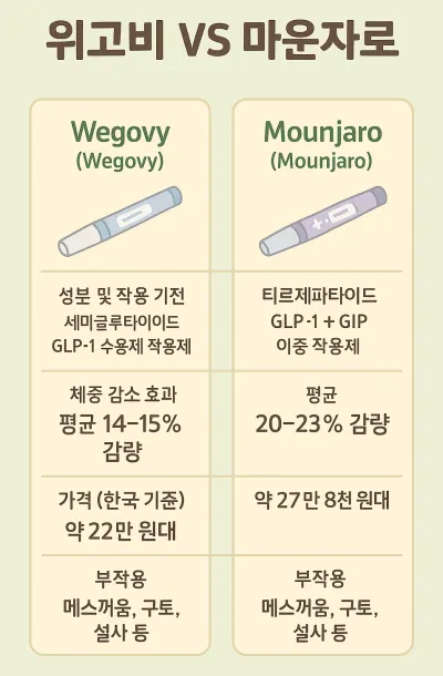 👉 핵심 차이는 위고비는 GLP-1 단일 작용제, 마운자로는 GLP-1+GIP 이중 작용제라는 점입니다. 이 차이가 체중 감량 효과의 강도와 대사 개선 폭에 영향을 줍니다.