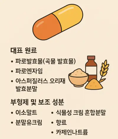 - 파로발효물(곡물 발효물): 곡물 발효 성분으로 장 활동과 소화에 도움을 준다고 광고됨