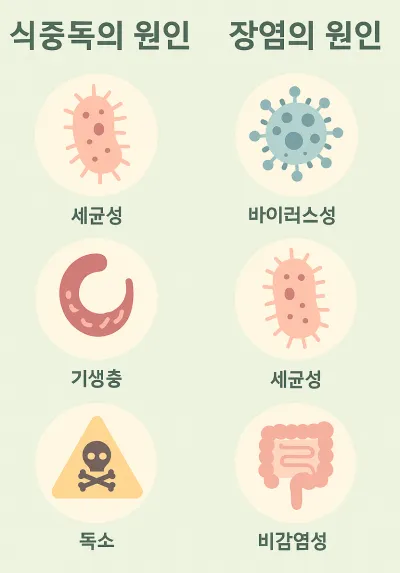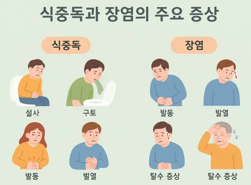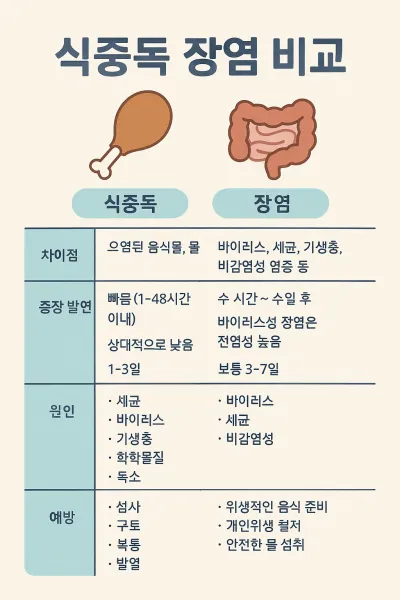 식중독 장염 비교 시 식중독은 대증 치료 중심, 장염은 원인 치료가 보다 강조됩니다.