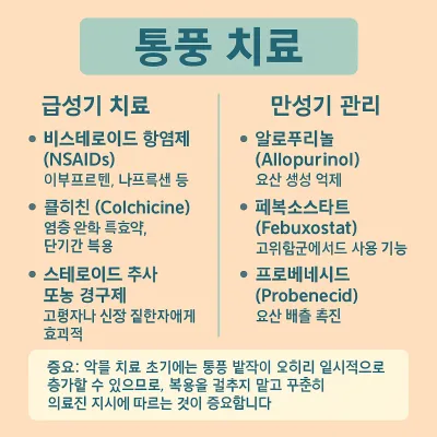 중요: 약물 치료 초기에는 통풍 발작이 오히려 일시적으로 증가할 수 있으므로, 복용을 멈추지 말고 꾸준히 의료진 지시에 따르는 것이 중요합니다.