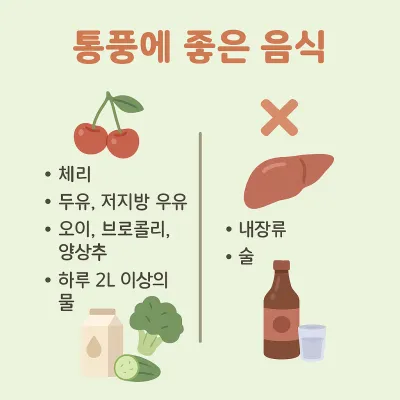 | 통풍 음식 | 내장, 술 금지 / 체리, 채소, 물 권장 |