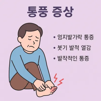 | 통풍 증상 | 발가락 통증, 관절염, 만성 요산결절 |