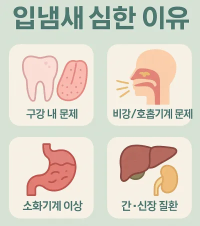 - 충치, 잇몸 질환(치주염), 설태(혀 백태), 구강건조증 등이 대표적이며, 입냄새의 약 80% 이상이 이 범주에 해당됩니다.
