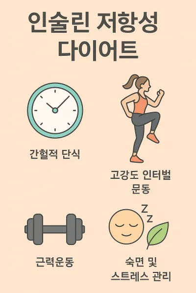 - 간헐적 단식(16:8): 식사 시간 제한을 통해 인슐린 분비 빈도 감소