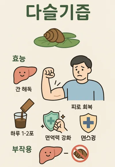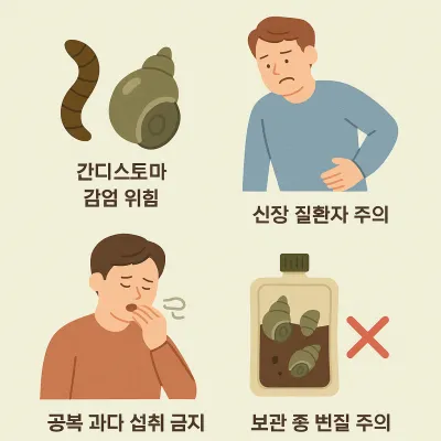 - 부작용: 생다슬기 섭취 금지, 과다 복용 주의