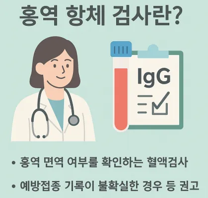 - 예방접종 기록 확인 또는 항체 검사 시행