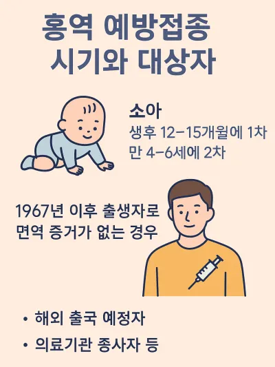 | 홍역 예방접종 시기 | 소아 12~15개월, 4~6세 / 성인은 항체 없을 시 접종 |