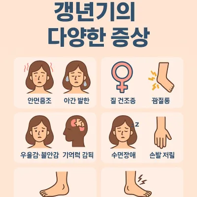 - 안면홍조, 식은땀, 야간 발한: 갑작스러운 열감과 땀이 수면을 방해