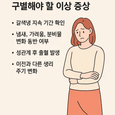 | 동반 증상 | 하복통, 가벼운 출혈 느낌 | 냄새, 가려움, 외음부 자극감 동반 가능 |