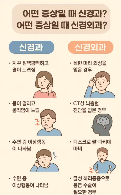 ‘신경’이라는 단어가 같다고 해서 같은 진료과로 오해하는 것은 매우 위험할 수 있습니다. 신경과는 약물 중심의 기능적 치료, 신경외과는 수술 중심의 구조적 치료라는 점만 기억해도 병원 선택이 훨씬 쉬워집니다.