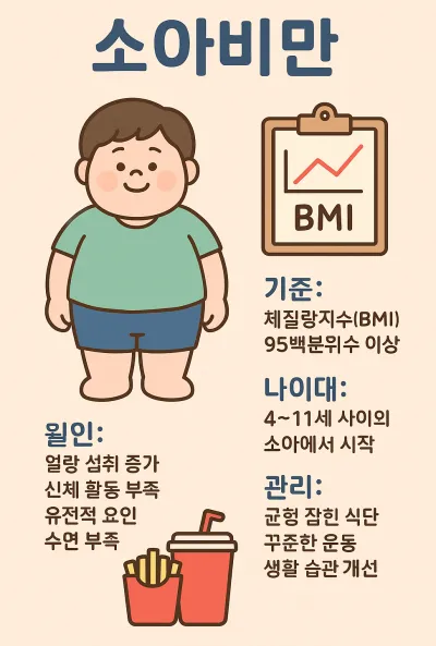 현대 사회에서 소아비만은 점점 심각한 보건 문제로 대두되고 있습니다. 과거에는 단순히 체형의 문제로만 여겨졌으나, 이제는 성장기 아동과 청소년의 건강을 위협하는 주요 요인으로 자리 잡았습니다. 특히 패스트푸드, 고칼로리 간식, 음료의 섭취가 늘어나고, 운동량은 줄어들면서 소아비만의 발생률은 꾸준히 증가하는 추세입니다. 더욱이 소아비만은 단순히 어린 시절에 그치는 것이 아니라 성인기 비만으로 이어져 고혈압, 당뇨병, 지방간 같은 성인병을 조기에 발생시키는 중요한 위험 요인입니다. 따라서 부모와 사회 모두가 소아비만의 기준, 원인, 식단 관리 방법, 예방 전략을 올바르게 이해하고 실천해야만 합니다. 이번 글에서는 소아비만의 정의와 기준부터, 발생 시기, 원인, 식단 및 관리 방법, 문제점, 그리고 자주 묻는 질문까지 폭넓게 정리해 드리겠습니다.