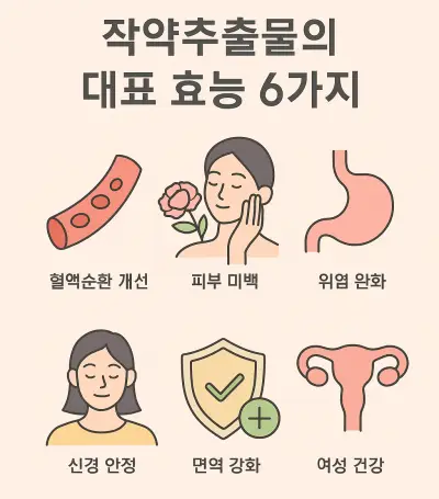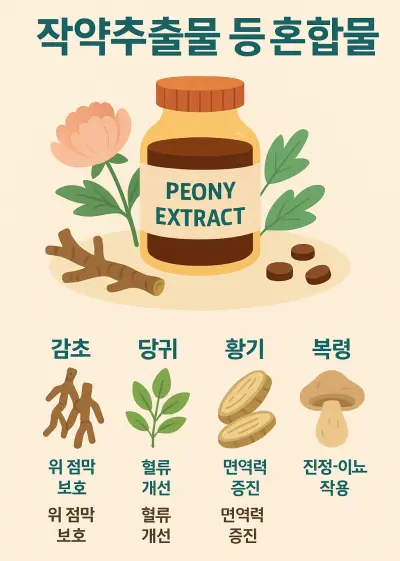 ‘작약추출물 등 혼합물’은 한방 복합 처방 개념으로, 감초·당귀·황기·복령 등의 생약을 함께 넣어 효능을 강화한 형태다.