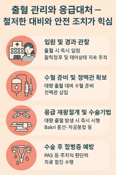 | 출혈 관리 | 입원 모니터링, Bakri 풍선/수혈/수술법 |