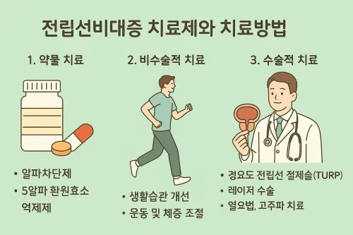 전립선비대증 치료는 증상의 정도, 전립선 크기, 합병증 유무에 따라 달라집니다. 다음은 주요 치료 옵션입니다.