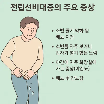 전립선이 커지면 요도를 압박해 배뇨 관련 문제가 가장 먼저 나타납니다. 아래와 같은 증상이 대표적입니다: