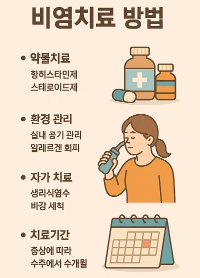 - 약물치료: 가장 많이 사용되는 치료법으로 항히스타민제는 재채기, 콧물에 효과가 있고, 스테로이드 비강 스프레이는 염증 억제와 점막 부종 완화에 도움을 줍니다. 충혈 완화제는 단기간 코 막힘 개선에 좋지만 장기 사용 시 약물성 비염이 생길 수 있습니다.
