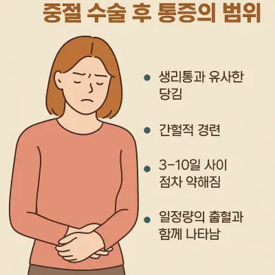수술 과정에서 자궁 내막이 제거되면 자궁은 원래 크기와 형태로 돌아가기 위해 반복적으로 수축한다. 이때 느껴지는 통증은 생리 첫날의 강한 생리통과 유사한 정도일 수 있다. 또한 이 수축은 출혈을 줄이기 위한 신체의 자연 반응이기도 하다.