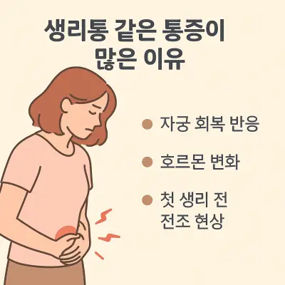 - 조직 배출이 끝나기 전까지 생리통 같은 통증이 흔히 동반된다.