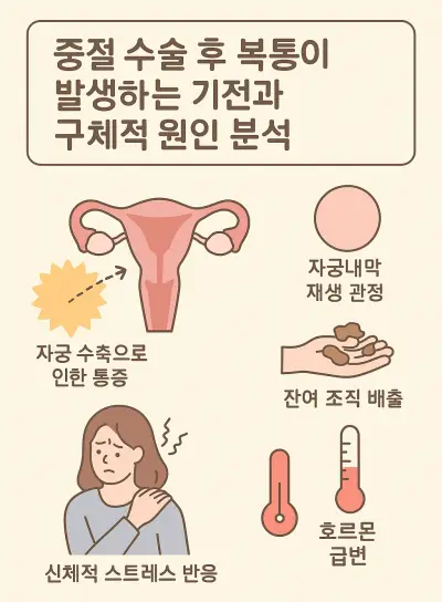중절 수술 후 나타나는 통증은 단순히 ‘수술해서 아픈 것’이 아니라, 자궁이 원래 상태로 돌아가기 위해 시행하는 생리적 회복 과정이다. 다음은 주요 원인을 좀 더 구체적으로 해부한 내용이다.