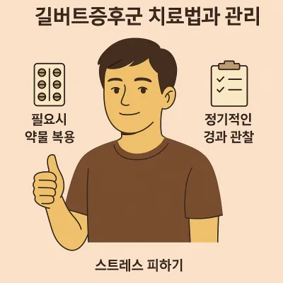 길버트증후군은 생명을 위협하지 않는 양성 질환이므로 특별한 치료가 필요하지 않다. 대부분은 증상 관리와 생활 습관 개선만으로 충분하다.
